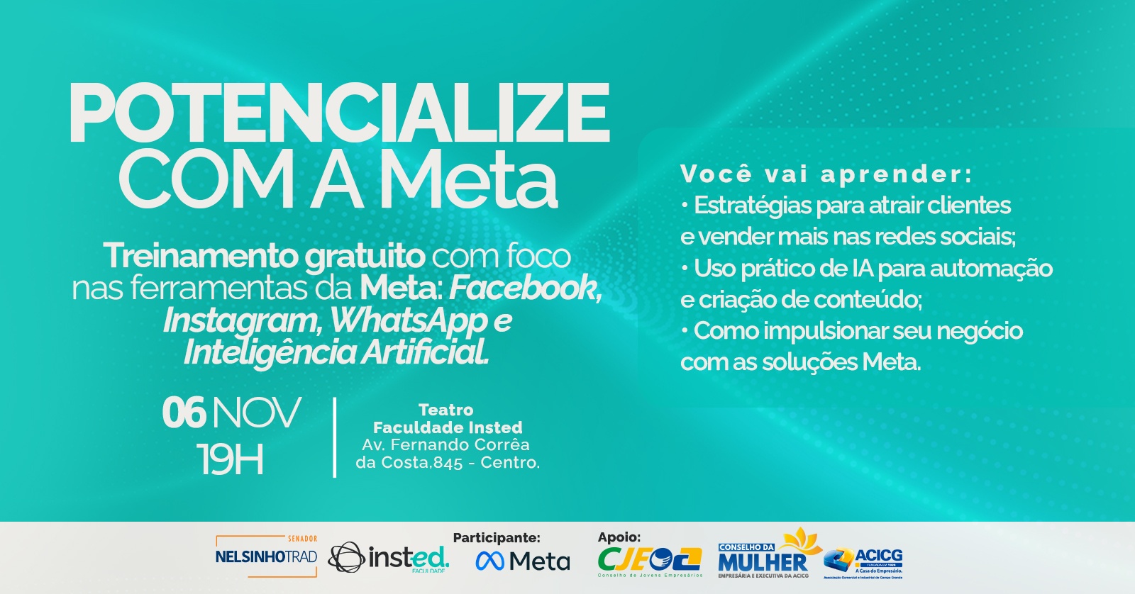 Em uma iniciativa que combina inovação tecnológica e espírito empreendedor, o treinamento gratuito Potencialize com a Meta será realizado no dia 6 de novembro de 2025, a partir das 19 h, no teatro da Faculdade Insted, situada na Avenida Fernando Corrêa da Costa, 845 – Centro de Campo Grande.