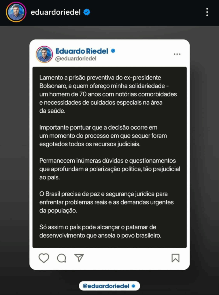 O governador de Mato Grosso do Sul, Eduardo Riedel, se manifestou em sua rede social sobre a prisão arbitrária do ex-presidente Bolsonaro .