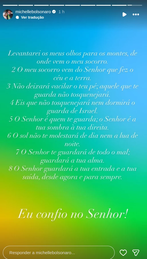 A reação da ex-primeira-dama Michelle Bolsonaro à prisão preventiva decretada contra Jair Bolsonaro (PL) veio cedo, neste sábado (22), em uma mensagem que buscou ao mesmo tempo acalmar sua base e denunciar, de forma indireta, o clima de perseguição que parte da direita enxerga nas ações recentes do Judiciário. Pelo Instagram, Michelle publicou o Salmo 121 — “Levantarei os meus olhos para os montes, de onde vem o meu socorro. O meu socorro vem do Senhor que fez o céu e a terra” — um recado claro de que, para ela, o momento exige resiliência e confiança.