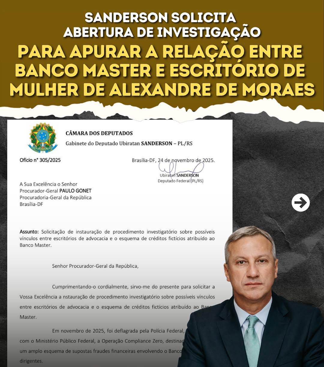 O deputado federal Sanderson (PL-RS) protocolou nesta terça-feira um pedido formal à Procuradoria-Geral da República para que seja aberta investigação sobre a possível relação comercial entre o Banco Master e o escritório de advocacia da esposa do ministro do STF, Alexandre de Moraes. A solicitação reacende o debate sobre conflitos de interesse envolvendo integrantes da Suprema Corte e fortalece o discurso da oposição por mais transparência no Judiciário.